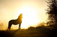 Trots staat ze daar op de heuvel in het vroege zonlicht, uitkijkend over het landschap onder haar. Ze weet dat ze mooi is en dat straalt ze ook uit. Deze mooie Friese merrie die wel even wilde poseren 's ochtends vroeg. De laagstaande zon achter haar en de mist geeft de foto een sfeervolle uitstraling. Deze foto zal aan iedere muur staan en een toevoeging zijn aan je interieur.