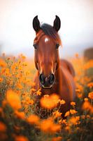Te midden van een heldere zee van oranjekleurige bloemen straalt een majestueus paard rust en gratie uit. Zijn zachte, glanzende ogen en soepele manen passen harmonieus in het kleurrijke decor. Het landschap straalt een nonchalante melancholie uit, terwijl de bloeiende natuur rondom het edele dier tot leven komt.