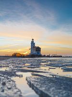 Winterkou in de ochtend het Paard van Marken word beschenen door de opkomende zon. Het water van het Markermeer is bevroren en breekt hier en daar in grote schotsen.