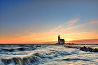 Vuurtoren Paard van Marken bij zonsopkomst en een stevige noord oosten wind