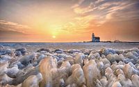 Paard van Marken onder winterse omstandigheden en een fraaie zonsopkomst