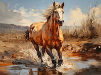 Het paard is getekend met behulp van een sketch-techniek, waarbij dunne zwarte lijnen en snelle penseelstreken zijn gebruikt om de beweging en gratie van het dier vast te leggen. De schets vangt de essentie van het paard op een expressieve en vrije manier, waardoor het een levendig en dynamisch kunstwerk wordt.
