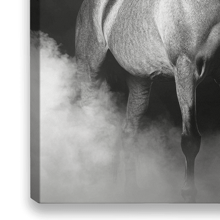 Het elegante silhouet van een nobel paard rijst majestueus op in een mystieke mist, zijn krachtige vorm en glamoureuze manen worden indrukwekkend benadrukt. De monochrome afbeelding straalt een tijdloze elegantie uit die perfect past in een moderne woonkamer en een gespreksonderwerp is. Ideaal voor dierenliefhebbers die op zoek zijn…