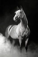 Het elegante silhouet van een nobel paard rijst majestueus op in een mystieke mist, zijn krachtige vorm en glamoureuze manen worden indrukwekkend benadrukt. De monochrome afbeelding straalt een tijdloze elegantie uit die perfect past in een moderne woonkamer en een gespreksonderwerp is. Ideaal voor dierenliefhebbers die op zoek zijn…