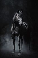 Een majestueus paard presenteert zich in diepzwarte elegantie, inspirerend met zijn krachtige aanwezigheid en zachte uitstraling. De mystieke sfeer, versterkt door een vleugje mist, geeft dit kunstwerk een fascinerende diepte. Ideaal voor in de woonkamer, waar het inspireert tot rustige gesprekken en creatieve gedachten.