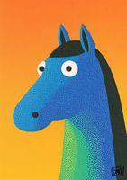 Paard - Dit paardenschilderij toont een vereenvoudigd, bijna cartoonesk paard in een stijl die doet denken aan pointillisme, uitgevoerd met levendige blauwe en groene stippen tegen een opvallend oranje achtergrond.