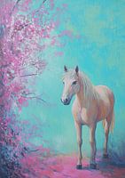Olieverfschilderij van een Arabisch paard onder een kersenbloesemboom, met roze en blauwe pastelkleuren, in een lentelandschap.