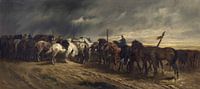 Een kudde paarden samengepakt onder een donkere wolkenlucht. De tamme dieren worden vergezeld door een herder of hoeder.