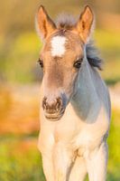 Paarden | Konikpaard veulen in warme avondlicht in de Oostvaardersplassen. Midden in de zomer en met de achtergrond kleuren van het bloemen landschap.