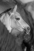 Over ‘Paarden | Zwart wit dieren - konikpaard veulen, Oostvaardersplassen’ van Servan Ott