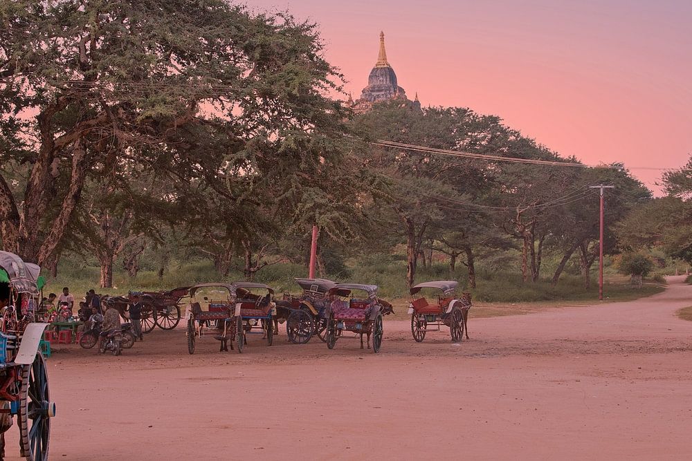 Paarden en wagens op een onverharde weg in het tempel gebied in Bagan Myanmar Azie bij zonsondergang