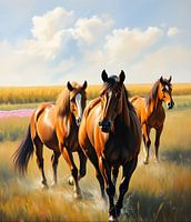 Deze afbeelding toont een verbluffende artistieke weergave van drie paarden die door een zonnige weide galopperen. De scène is doordrenkt met een gevoel van vitaliteit en vrijheid, terwijl de paarden met kracht en gratie bewegen. Hun rijke, kastanjebruine vachten glinsteren onder het warme zonlicht en reflecteren gouden tinten die hun gespierde vormen versterken. De voorgrond legt de dynamische beweging van spattend water onder hun hoeven vast, wat hun energie en kracht benadrukt.