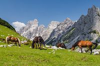 Een kudde paarden brengt de zomermaanden door op een sappig groene alm aan de voet van de grillig gevormde bergen van de Gosaukamm.