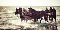 Tijdens de demonstratie met de paarden reddingsboot op Ameland liepen deze paarden door de golven.