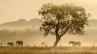 Paarden grazen in een weiland. De zonsopkomst en mist zorgen voor een sfeervol beeld.