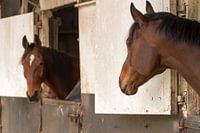 Is het een spiegelbeeld of niet. Zijn het 2 paarden die met elkaar communiceren? Deze paarden rusten uit in de stal en hebben duidelijk contact met elkaar.