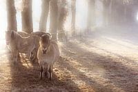 Paarden in de winter in de wei in de mist. De foto is genomen op een koude winter ochtend en de zon en de mist geven de foto een mystieke sfeer. De paarden warmen zich op in het ochtend licht.