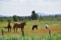 Paarden in een weiland in de zomer, Sainte-Apolline, Québec, Canada