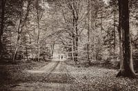 Een bosrit met paarden in het bos tijdens de herfst periode. Een klassieke oude vintage retro style van een landschap met paarden op een bospad.