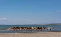 Paarden rennend in het water van een meer in Mongolië.