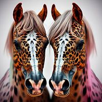 Twee paardenkoppen afgebeeld met een luipaard vacht en dalmatiër stippen. De roze gloed maakt het werk helemaal af.