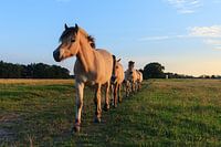 Aan de rand van een Nederlands natuurgebied lopen paarden. Ze komen in een rij achter me aan wanneer ik een veld oversteek. Ze worden mooi beschenen door het avondlicht.