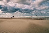 paarden met sulky op het Noordzeestrand tijdens de herfst perioden. Tevens mooie wolkenluchten boven de Noordzee.