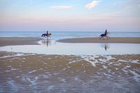 Paarden op het strand van Koksijde (België) met de kleuren van een zonsopkomst in de lucht.