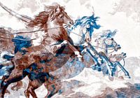 Digitale kunst waarop een groep aangespannen op hol geslagen paarden te zien is. Dit werk heeft een neutrale kleurstelling en past daarom in vrijwel elk interieur.