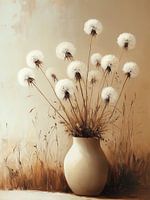 Dit schilderij toont een dromerige, nostalgische weergave van een boeket paardenbloemen in een aardewerken kruik in een veld van wuivend gras. De zachte, warme tinten in sepia en beige creëren een rustieke en serene sfeer, terwijl de gedetailleerde penseelstreken de delicate structuur van de zaadbollen benadrukken. De achtergrond vervaagt subtiel in een mistige gloed, waardoor een gevoel van diepte en melancholie ontstaat. Dit kunstwerk straalt een tijdloze schoonheid uit en roept een gevoel van vergankelijkheid en zachtheid op.