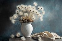 Een tijdloos stilleven waarin uitgebloeide paardenbloemen hun zachte, pluizige zaadhoofden tonen in een sobere witte vaas. De compositie, geschilderd tegen een mysterieuze turquoise-grijze achtergrond, wordt verrijkt door een elegant gedrapeerde linnen doek. De delicate pluizenbollen creëren een etherische, bijna dromerige sfeer die de vergankelijke schoonheid van de natuur vastlegt.