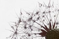 Een verbluffende macrofoto van een prachtige paardenbloem, badend in het ochtendlicht met een eenvoudige, doch betoverende witte achtergrond die een subtiel tegenlicht creëert. Deze rustgevende opname brengt de levendige schoonheid van de ontluikende lente naar binnen, waar de tere details van de natuur tot leven komen in een moment van serene perfectie.