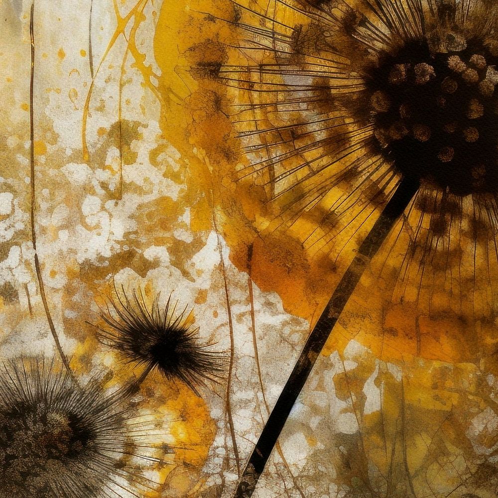 Het abstracte ontwerp is een meesterwerk van moderne kunst met een prachtige mix van goud-, bruin- en zwarttinten. Het midden van het schilderij wordt gedomineerd door een prachtige paardenbloem waarvan de bloemblaadjes helder goud zijn en glinsteren met een stralende gloed. Rondom de bloem baadt het schilderij in warme, rijke bruintinten en diepzwarte tinten die samenvloeien om een gevoel van diepte en textuur te creëren. De gouden tinten gloeien en glinsteren tegen de donkere achtergrond, waardoor het schilderij een gevoel van warmte en diepte krijgt dat tot de verbeelding spreekt. Dit is een schilderij dat de aandacht opeist, een waar kunstwerk dat iedereen die het bekijkt zal betoveren en inspireren.