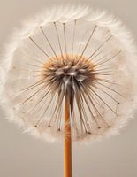 een rustig minimalisme art macro portret van een paardenbloem pluisjes in wit, bruin, en zachte kleuren voor jong en oud.