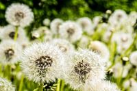 Zaden van paardenbloem of paardenbloem met bokeh op bloemenweide in de lente