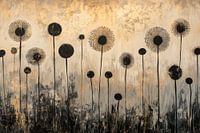 Abstract grafisch kunstwerk met paardenbloemen en paardenbloem pluis in goud/bronskleur met zwart