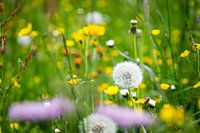 In een wei vol bloemen steekt één paardenbloem er tussen uit. Alleen de zaden van deze blaasbloem zijn in focus.