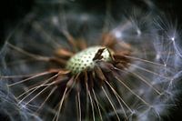 Macro shot van een uitgebloeide paardenbloem waarbij de focus op het centrale gedeelte van de bloem ligt, waardoor een mooie scherptediepte ontstaat.