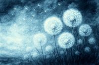 Stijl in blauwe print...paardenbloemen en vliegende zaden met lucht als achtergrond...