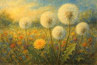 Paardenbloemen badend in warm licht in een romantisch nostalgisch landschap ...