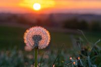 In het park in het gras groeien Paardebloemen met zaden op de kruin met zonsopgang