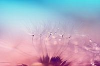 Stap binnen in een wereld waar realiteit en droom samensmelten. Dit betoverende kunstwerk vangt de magie paardenbloempluisjes, gehuld in dromerige blauwe en roze tinten en verfijnd met fonkelende dauwdruppels. Elk detail, van de fluweelzachte vezels tot de spiegelende druppels, straalt een haast sprookjesachtige mystiek uit.