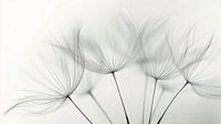 In deze verfijnde fotografische compositie zweven delicate paardenbloempluizen als elegante dansers tegen een lichte achtergrond. De zachte grijstinten en de ragfijne structuur van de zaden creëren een etherische sfeer die tegelijk rust en beweging uitstraalt. Het beeld vangt het vluchtige moment waarop de natuur haar meest subtiele schoonheid toont.