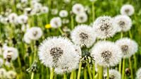 Zaden van paardenbloem of paardenbloem met bokeh op bloemenweide in de lente