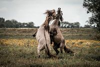 Deze krachtige opname toont twee wilde paarden midden in een fysiek duel, rechtop staand, hun lichamen gespannen en manen vliegend in de lucht. De openheid van het veld en het zachte, bewolkte licht leggen de nadruk op de intensiteit van hun confrontatie. Met hun gespierde lichamen volledig in actie en een palet van gele veldbloemen onder hen, ontstaat er een indrukwekkend contrast tussen de rauwe kracht van het moment en de zachtheid van de natuurlijke omgeving. Een beeld dat de oerkracht van dierenrijk en landschap samenbrengt in één dramatische scène.