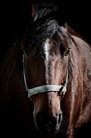 Een mooi bruin paard met een zwarte achtergrond. Verticale close-up van het hoofd.