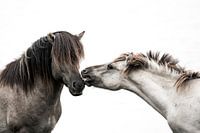 In deze expressieve paardenfoto ontmoeten kracht en tederheid elkaar in een moment van levendige interactie. Het jonge, lichtere paard toont een speelse benadering richting het donkerharige paard, wiens lange manen mysterieus over zijn ogen vallen. De minimalistische witte achtergrond benadrukt het sterke kleurcontrast en legt de focus volledig op hun lichaamstaal en onderlinge band. Dit kunstwerk spreekt tot de verbeelding van iedere dierenliefhebber en brengt dynamiek, emotie en natuurlijke elegantie samen in één krachtig beeld.