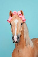 Met een charmante glimlach en een kapsel waar zelfs de beste kappers jaloers op zouden zijn, is dit paard het middelpunt van de belangstelling. De roze krulspelden voegen een vleugje glamour toe, terwijl de lichtblauwe achtergrond het levendige tafereel perfect aanvult. Een werkelijk uniek gezicht!