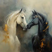 Een wit en zwart paard spelen samen in de wind. Een prachtig werk voor een je muur! Voor de echte paardenliefhebbers!