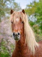 Aegidienberger een zeldzaam paardenras, een gangenpaard gekruist uit Duitsland tussen de Peruaanse Paso en het IJslandse paard, portret voor bomen in het voorjaar, de vachtkleur is vlaskastanje